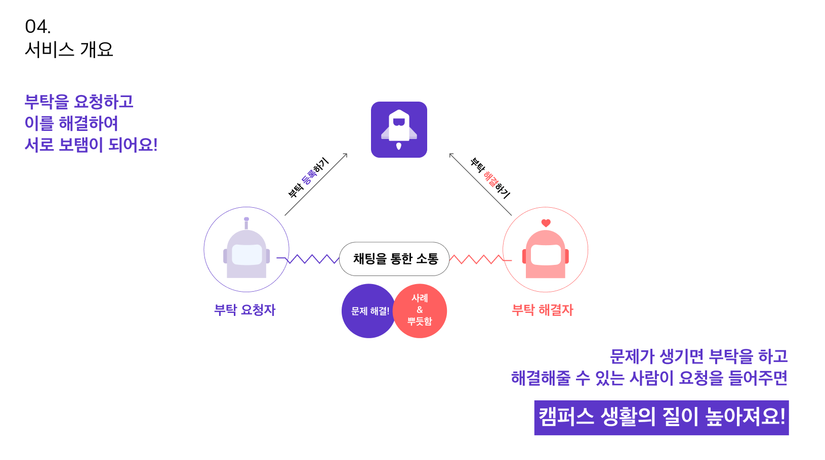 이번 해커톤의 주제는 위드코로나 시대 대학생들을 위한 앱 서비스를 제작하는 것이다. 코로나 이전의 일상으로 돌아가기 위한 전략, 대학생들의 삶의 질 향상이 포인트였고 우리 팀은 혼란스러운 위드코로나때문에 일어나는 공간/시간 제약의 불편함을 해결하고자 교내 학생들끼리 서로가 서로의 도움이 될 수 있도록 하는 플랫폼을 기획했다.