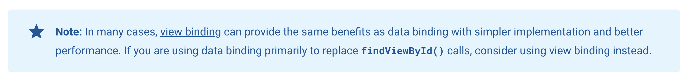 참고로, 뷰바인딩을 사용하는것이 데이터바인딩을 사용하는것보다 구현이 간단한 편이고 더 나은 성능을 내는 편이라고 한다. 따라서 공식문서에서는 단순히 findViewById()를 쓰지 않기 위한 목적으로 바인딩을 하는것이라면 뷰바인딩을 쓰는것을 권장하고있다.